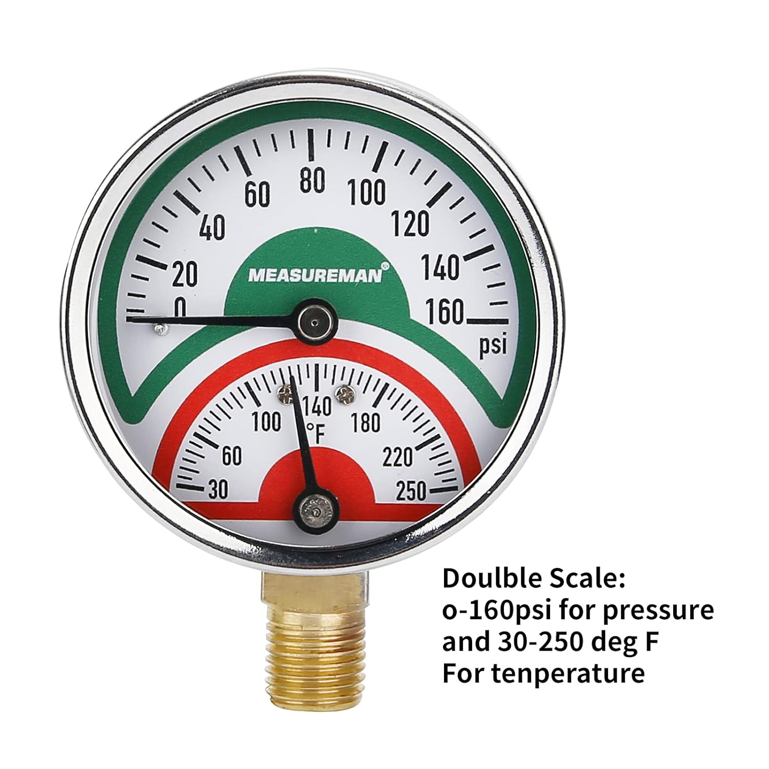 MEASUREMAN Tridicator, Thermo-Manometer, 2-1/2", 0-160psi/30-250 deg F, Stainless Steel Case, 1/4" NPT Lower Mount Pressure Gauge