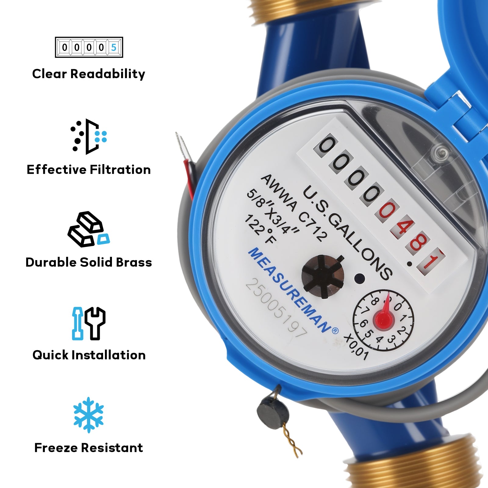 MEASUREMAN 3/4" Single-Jet Pulsed Brass Water Meter Gallons Measurement in Irrigation Systems